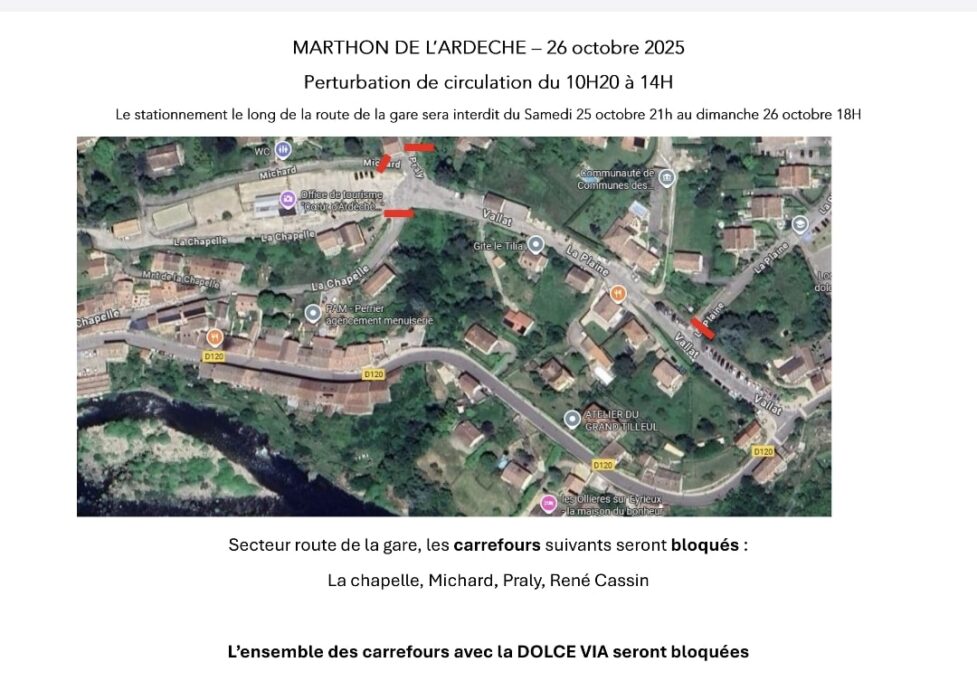 La circulation sur la RD120 sera également coupée entre 10h45 et 11h15, au niveau du carrefour de la gare, afin de permettre aux coureurs du semi-marathon de traverser la route en sécurité.