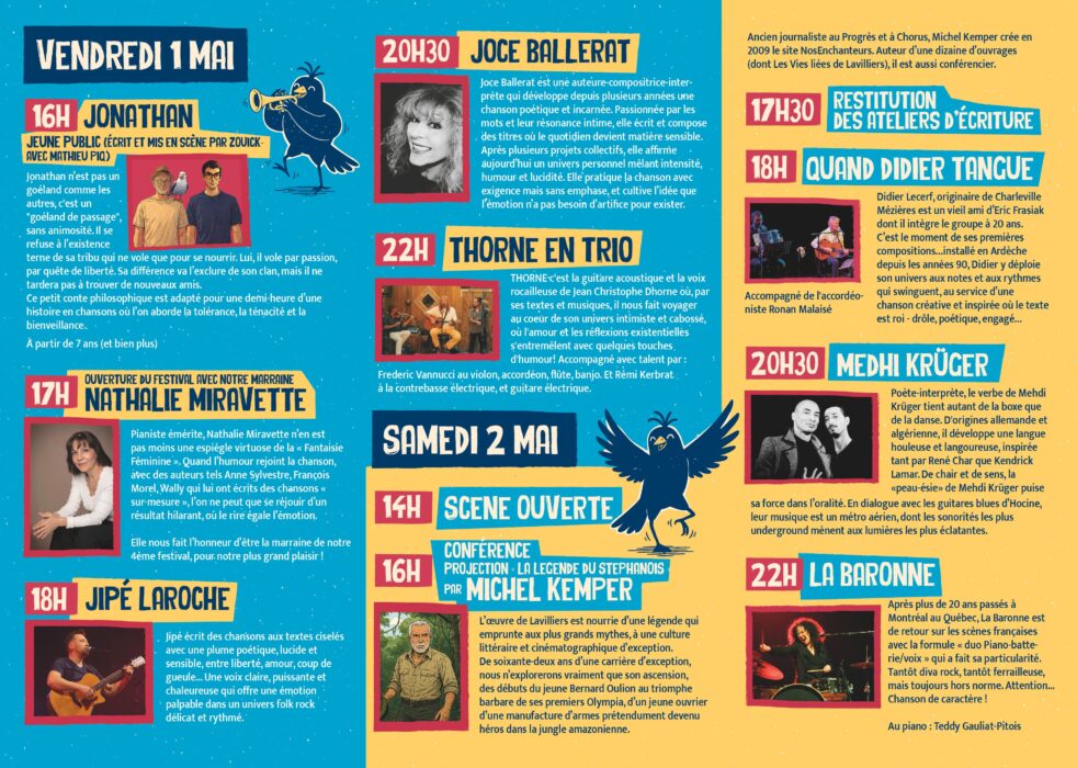 Pendant deux jours, venez vivre un festival à taille humaine où la chanson française se découvre dans l’émotion, la curiosité et la rencontre.