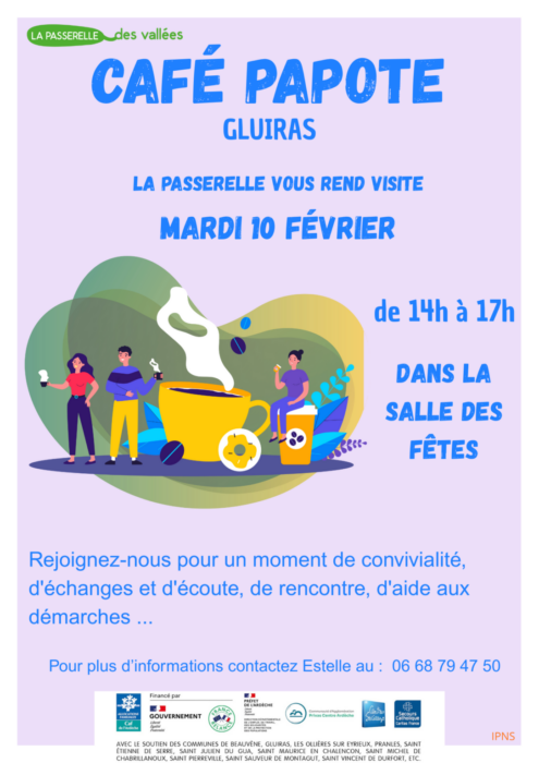 Mardi 10 février 2026 : Café papote à Gluiras dans la salle des fêtes de 14h à 17h. En même temps que le club tricot/couture “Les petites mains de Gluiras”, venez partager un moment conviviale et chaleureux avec nous.Pour plus d’information contactez Estelle : 06.68.79.47.50