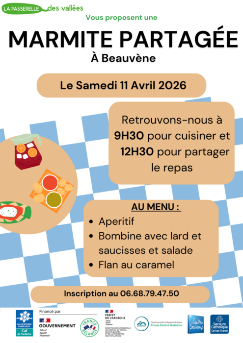 Samedi 11 Avril 2026 : Marmite partagée à la salle des fêtes de Beauvène. Retrouvons nous à 9h30 pour cuisiner ensemble ou à 12h30 pour partager le repas. Au menu : apéritif, Bombine avec lard et saucisses, salade et Flan au caramel Inscription : 06 98 55 88 83