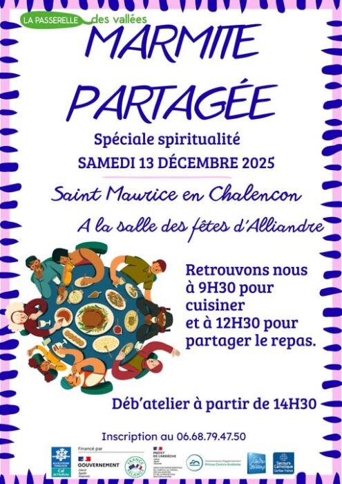 La prochaine marmite aura lieu le 13 décembre à la salle des fêtes d’Alliandre avec comme thème “La spiritualité”.